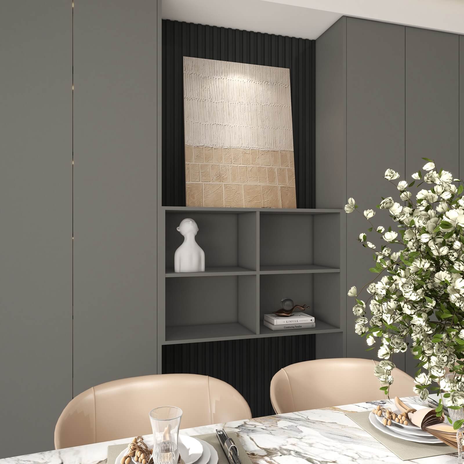光影流动,木饰面、大理石、木格栅交织出不同层次秩序,给予空间精致质感。